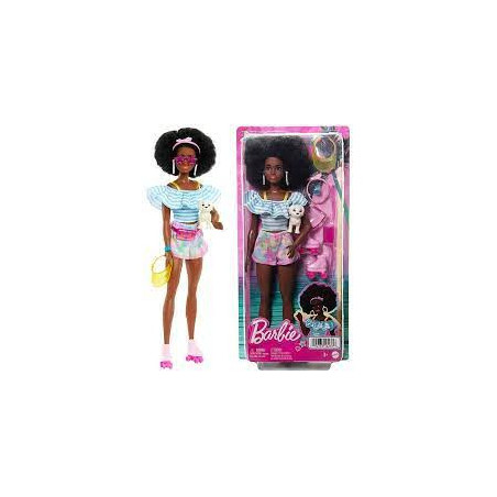 Barbie® Day & Play Rollerskating Doll -With her original look, trendy accessories and puppy, this Barbie doll is ready for all sorts of adventure!She wears an off-shoulder, ruffled blouse with tie dye shorts. Her Afro cut highlights her gorgeous curly brown hair and she gets around on adorable pink roller skates.