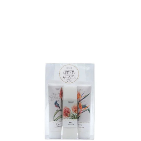 The Hand Care Trio includes a gorgeous fynbos-scented hand cream (30ml tube), Shower Gel (30ml tube) and a square Nail Buffer (9.5cm). The set features the beautiful South African Celebration artwork and comes packaged in a clear acetate box.