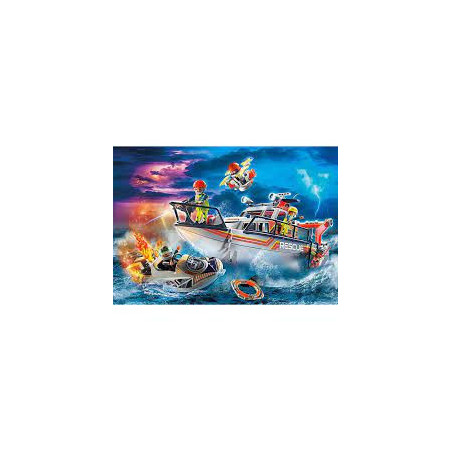 Playmobil Fire Rescue with Personal Watercraft - At sea, the sea rescue takes care of people in need. The captain of the rescue cruiser is just receiving a distress call. A speedboat has caught fire and the driver's life is in danger. Quickly the rescue crew sets off to the coordinates given.