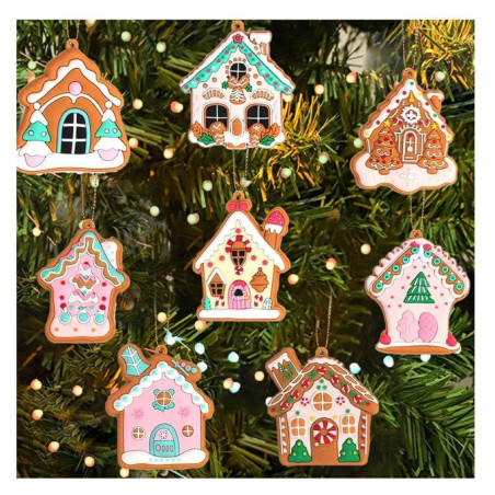 Gingerbread House Tree Ornaments (PVC) - A set of 8 super cute Gingerbread House Ornaments to hang on your Christmas Tree. Set includes 8 highly detailed, assorted gingerbread houses in fun festive cookie colours. These would also be super cute if tied onto gifts with twine.