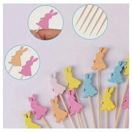 These versatile wooden bunny sticks come in packs of 10 assorted pastel colours. Great for decorating cakes, party food, fruit skewers, table centerpieces and for embellishing gifts.