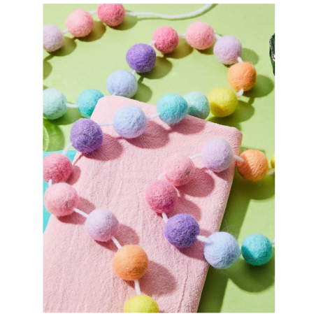 Garland is approximately 2m long and includes 30 pom-poms in assorted pastel rainbow colours. Pom-poms are about 2cm in diameter.