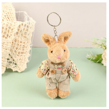 Beautiful and soft plush bunny rabbit key chain / bag accessory with a gorgeous floral print shirt and adorable dungarees. This little bunny is super soft and has the cutest little details. He measures approximately 15cm tall and has a metal ring and chain attachment so that he can be attached to a bag or keys.