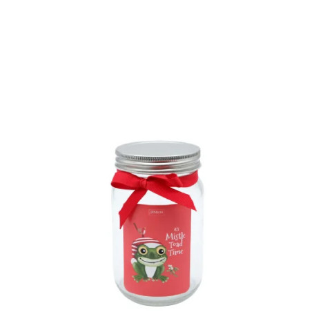 Jenam Christmas - Small Jar - Toad - For an easy but personalised gift, fill this little jar with the recipients favorite treats, stationery, body products, money or anything else that will fit! Clear glass jar with silver twist lid with red fabric bow and a label featuring a cute festive toad and the words "It's Mistle Toad Time".