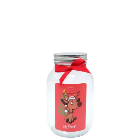 Jenam Christmas - Large Jar - Oh Deer! - For an easy but personalised gift, fill this little jar with the recipients favorite treats, stationery, body products, money or anything else that will fit! Clear glass jar with silver twist lid with red fabric bow and a label featuring a cute festive Reindeer with the words "Oh Deer!".