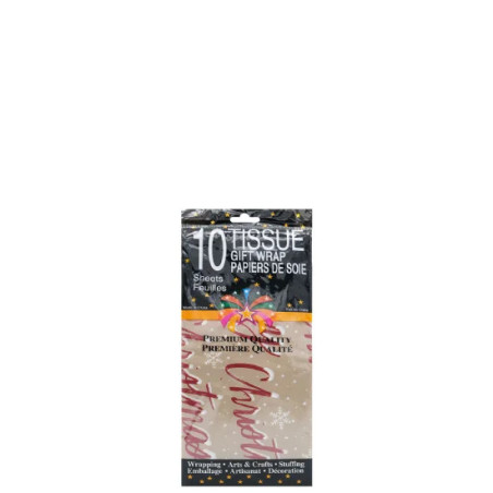 Tissue Paper - Merry Christmas (10 sheets) - Pack of 10 sheets of tissues paper - Gold with red and white snowy "Merry Christmas" print. Perfect for festive gift wrapping!