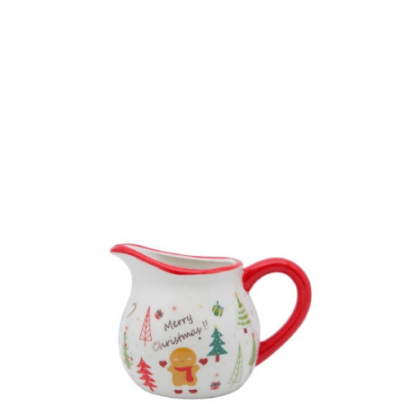 Whether you are having Christmas morning coffee in your Pj's or hosting a festive tea party, this little milk jug is sure to bring some festive cheer! The Jug features bright red accents, an adorable all over Christmas print of assorted trees, gingerbread man and wrapped gifts and the words "Merry Christmas" in a metallic bronze print. Jug holds 350ml and is made of ceramic.