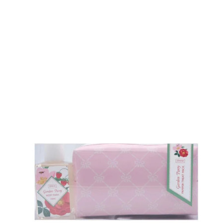 The Garden Party Pamper Treats Gift Set includes a 150ml beautifully scented body wash and 50g body butter, as well as a cosmetic bag (19 x 9 x 11cm) with pretty pink ribbon design. Cosmetic bag is made out of an easy to clean, soft PU fabric and features a zip with Jenam pull tab and a carry strap. . All items are beautifully coordinated and come packaged in a clear acetate box.