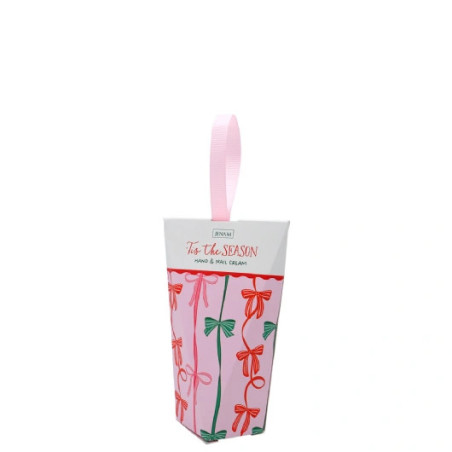 Hand cream (50ml) in squeeze tube. Box features cute Bow Ho Ho ribbon bow print with the words "Tis the Season".