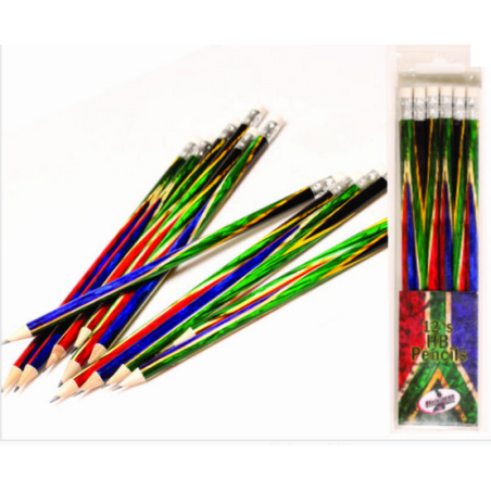 A pack of 12 pencils featuring the South African flag as body design. Equipped with HB hardness level for smooth and dark writing. Comes with eraser tips for convenient use.
