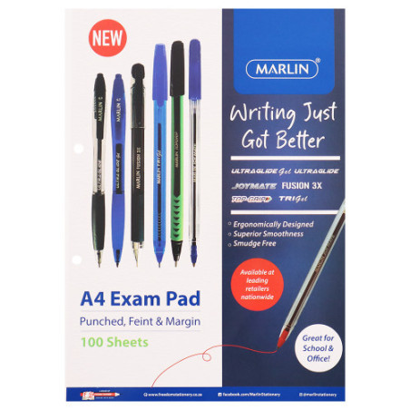 Marlin 100-Page Exam Pad (F&M, Punched) - 100 sheet exam pad featuring feint lines and margin, as well as two pre-punched holes for easy filing. Assorted cover designs.