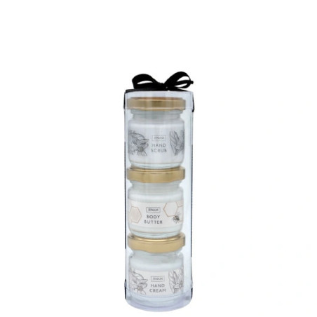 Treat your hands with the calming, moisturising and healing effects of Nerioli and Honey! This beatiful gift set includes three glass jars featuring the beautiful Jenam Bee artwork, stylishly packaged in an acetate gift tube with a black fabric ribbon. The three jars contain 35g Body Butter, 35g Hand Scrub and 35ml Hand Cream.