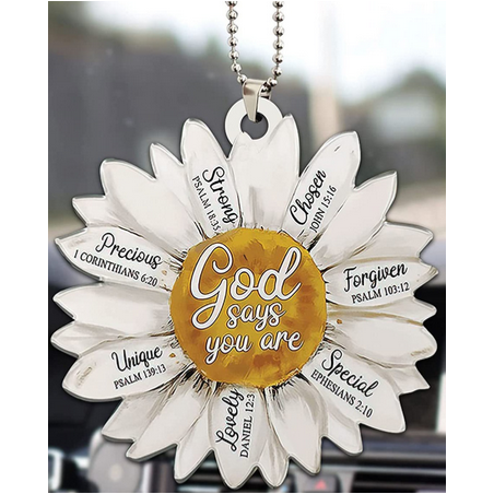 God Says Keychain / Tree Decoration - A beautiful acrylic Daisy featuring reminders from the bible about who God says you are. Give it as a gift to somebody special, attach it to a bag or keys, or hang it on your own Christmas tree as a festive reminder of how amazing you are!