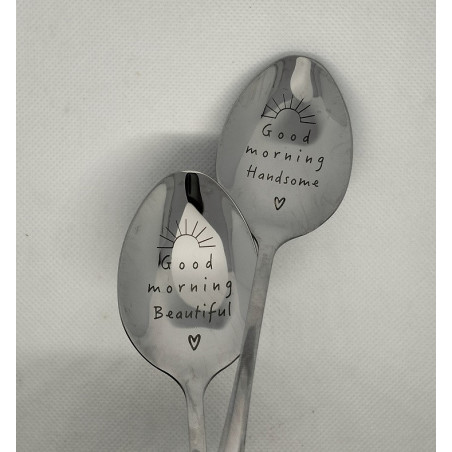 Couples Cereal Spoons (set of 2) - An adorable set of spoons for couples. Add that "something special" to a couples-themed foodie hamper - a great idea for newly weds or anniversaries! Set includes two spoons (18.8cm), one with the words "Good Morning Beautiful ♥" and one with the words "Good Morning Handsome ♥".