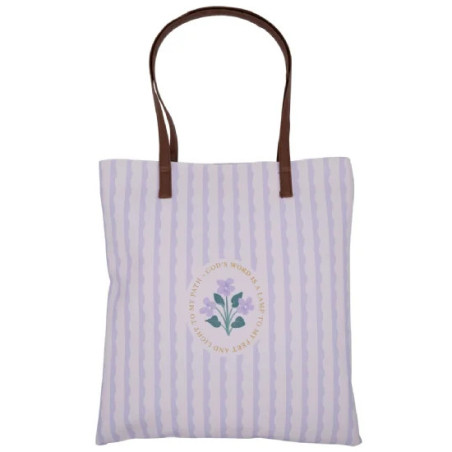 The Scripture & Verse Shoulder Bag is a large (tote-bag size) bag made from an easy wipe fabric with an all over purple stripe print and a floral image on front and back with the words "God's word is a lamp to my feet and a light to my path". A beautiful bag with an encouraging reminder. Give it as a gift or keep it for yourself. Bag is made from a soft PU fabric and measures 33 x 36cm (excluding straps).