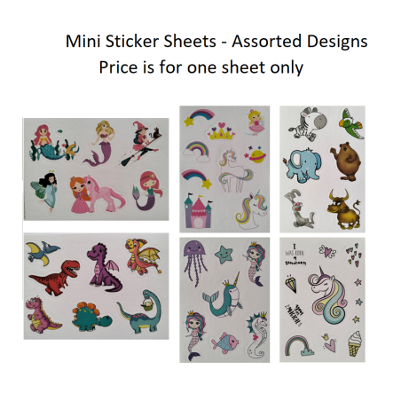 Mini stickers sheets in assorted designs - great for party favors, Christmas crackers, Easter Hunt, activity packs, school carnivals or reward prizes.
