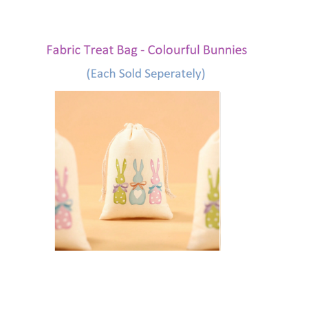 Beautiful fabric treat bag with a drawstring tie and gorgeous little colourful bunny print. Fill it with Easter treats and use it as a table gift, party favor or for the Easter hunt. Price is for one bag only.