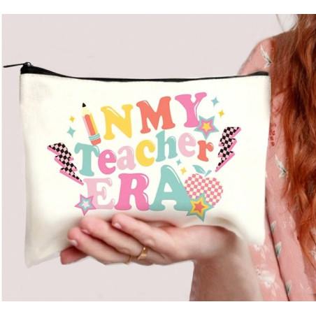 The Teacher Appreciation Teacher Era Pouch is a super cute zipped pouch with a print that says "In my Teacher Era. This pouch can be filled with any type of treats (or included in a gift box with treats) such as stationery, sweets, chocolates, or body treats. A cute gift for a special teacher that deserves a treat this school year-end.