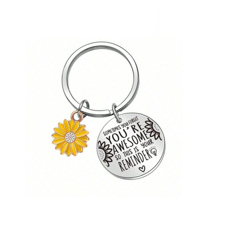 The Teacher Appreciation You're Awesome Keyring features a metal keyring with with a metal round disc that says "Sometimes you forget you're awesome - so this is your reminder" with a cute little flower charm. A cute, but useful little gift. Give it with a card or attach it to one of our Teacher Appreciation zipped pouches (sold separately) or make up a beautiful and unique hamper with other items from our gift range.